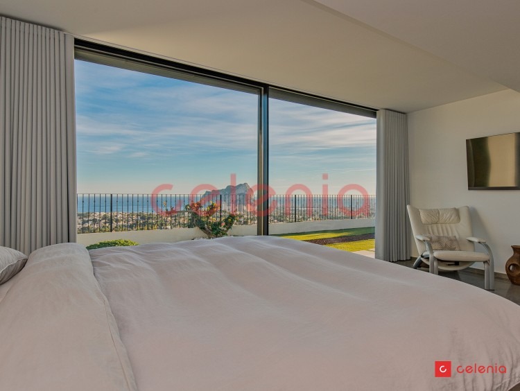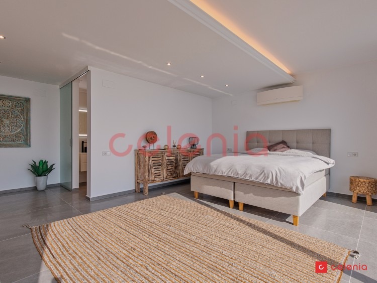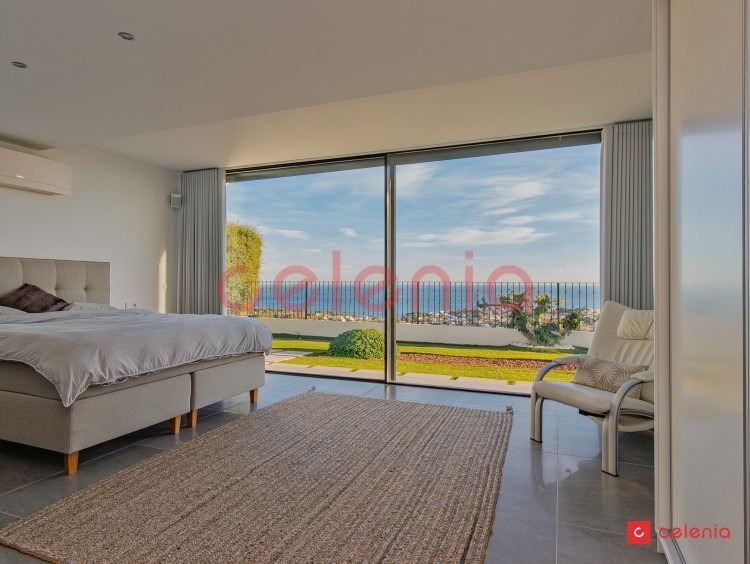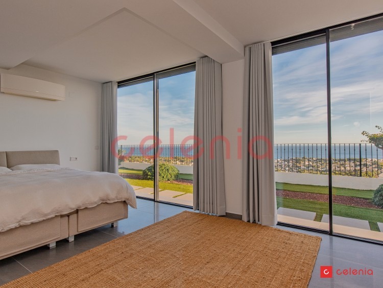 -Dormitorio principal en suite con vestidor, baño privado y terraza exclusiva con pérgola. Desde la cama, gracias a sus grandes ventanales, podrás deleitarte con las magníficas vistas al mar.