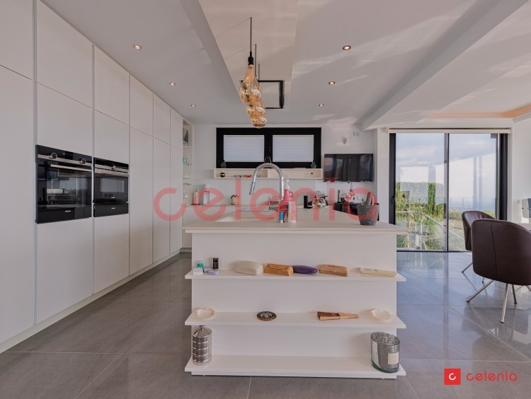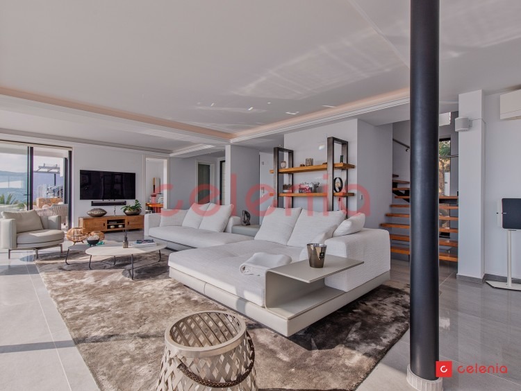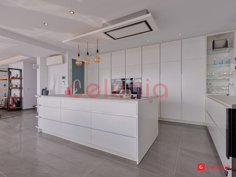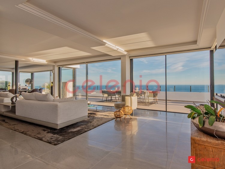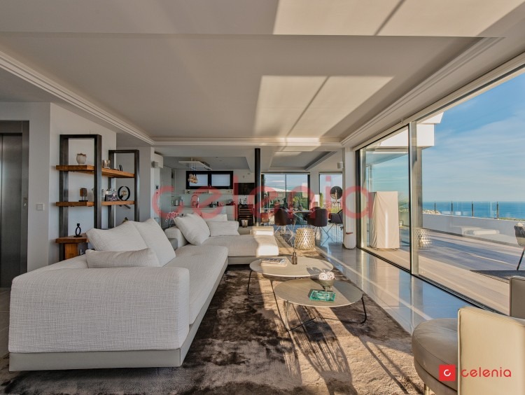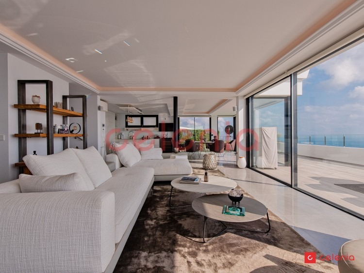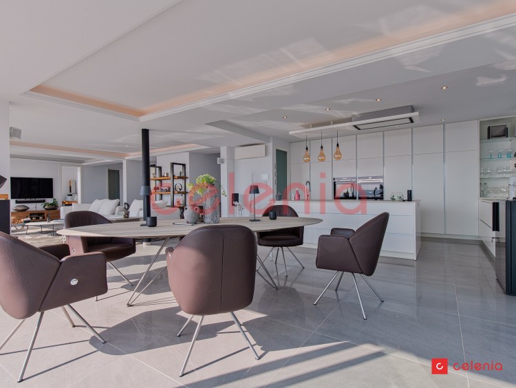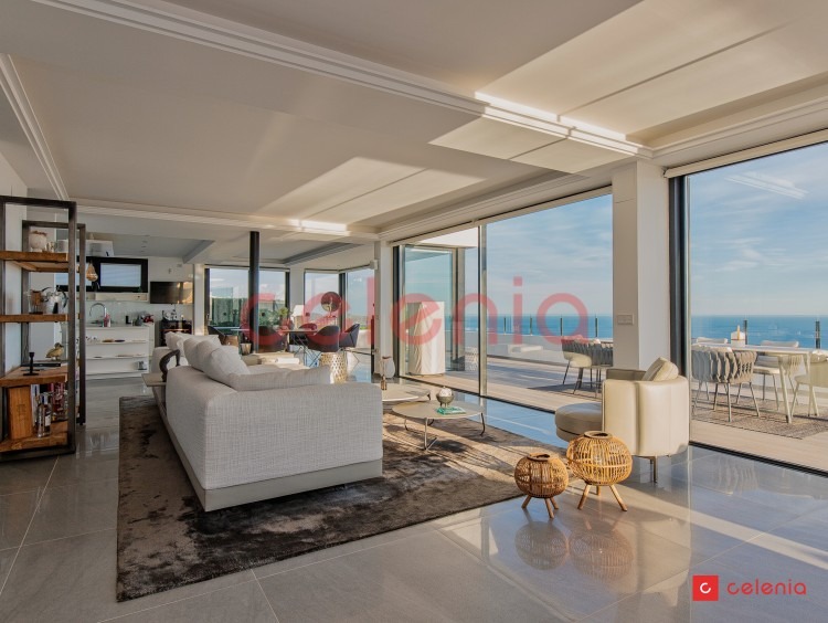 -Espacio diáfano compuesto por salón-comedor y cocina de diseño rodeado de amplias cristaleras que inundan el espacio de luz natural y ofrecen vistas inigualables al entorno marino.