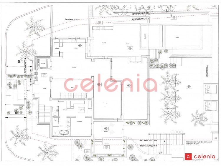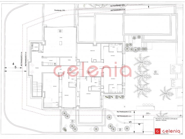 - Planta baja, a esta planta se puede acceder por una escalera interior o por un ascensor. Se distribuye en un pequeño recibidor, zona de gimnasio, lavadero y trastero, sala de cine y 4 dormitorios con baños en suite. En esta planta también se encuentra el garaje con capacidad para 2 coches.